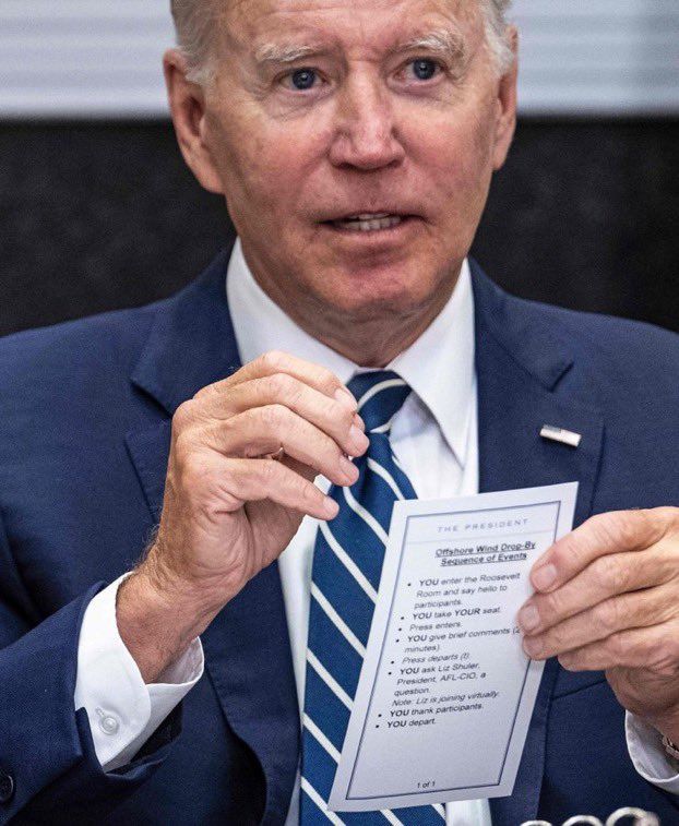 6/23/2022: Joe Biden accidentally reveals cheat sheet reminding him to 'take YOUR seat', 'YOU give brief comments (2 minutes)' and 'YOU depart' at the meeting with wind-industry executives.