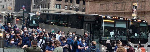 Texas Buses arrive in New York City and unload immigrants.