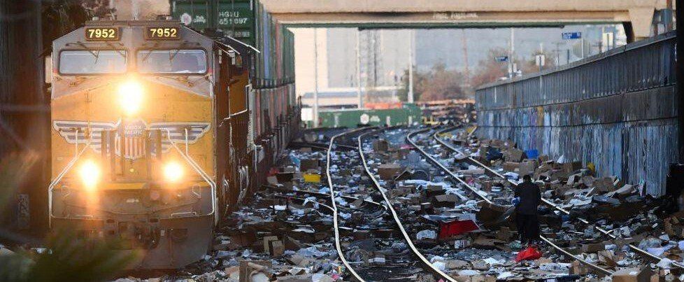 1/21/2022: Thousands of delivery boxes strewn along Los Angeles railroad tracks — the result of large-scale organized looting from broken-into cargo cars that's been an ongoing problem.