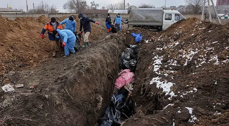 march 2022: Massive murdered Ukrainians are placed in body bags, thrown into deep ditches and cover over in Unceremonious Graves.